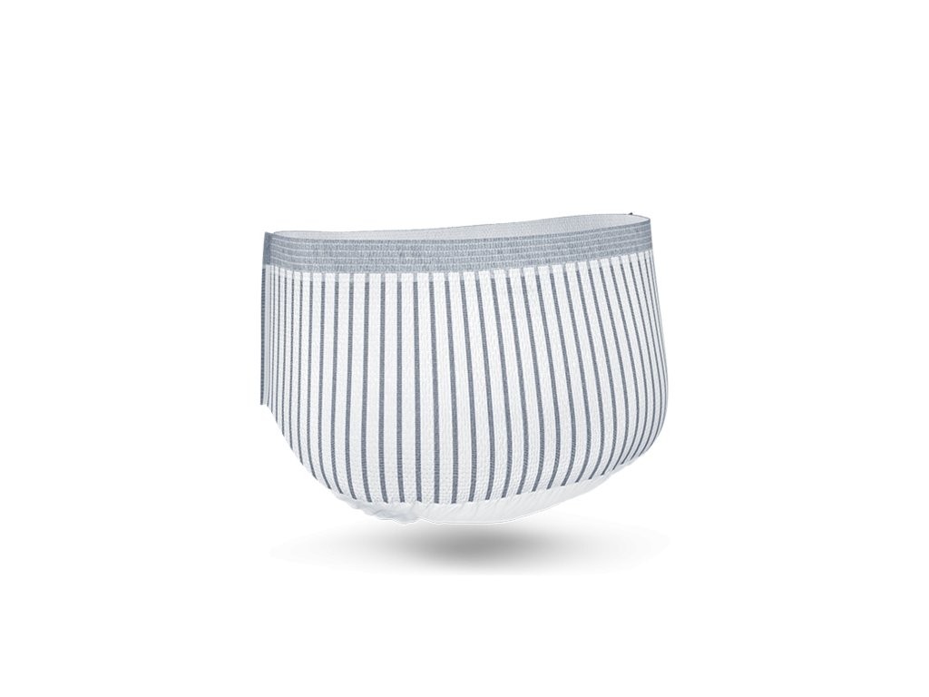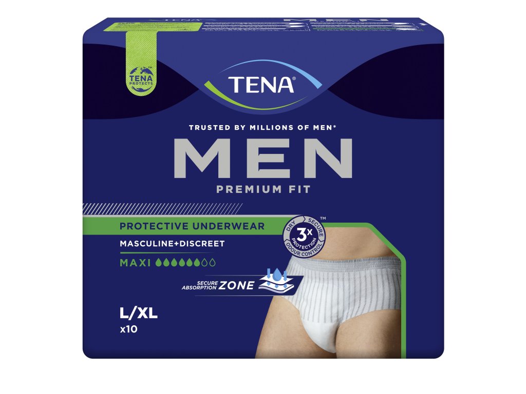 Moderná inkontinenčná pánska spodná bielizeň TENA Men Pants Protective Underwear je určená pre mužov so stredným až ťažkým únikom moču. Navrhnutá ako bežná spodná bielizeň s diskrétnym strihom pánskeho spodného prádla. Absorpčná zóna poskytuje dokonalú ochranu proti, pretečeniu, vlhkosti a zápachu. Spodná bielizeň sa dokonale sa prispôsobí tvaru mužského tela a zaručuje maximálnu diskrétnosť pri nosení. Je dermatologicky testovaná a nedráždi pokožku. Rýchlo absorbuje moč a uzatvorí ho vo vnútri absorpčného jadra. Absorpcia: 1430 ml, obvod bokov: 95-125 cm