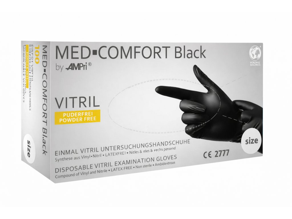 Vitrilové rukavice MED-COMFORT Black veľkosti L sú prémiové jednorazové vyšetrovacie rukavice vyrobené zo zmesi vinylu a nitrilu (vitril). Tento moderný materiál kombinuje pružnosť a odolnosť nitrilu s výhodnou cenou vinylu, pričom neobsahuje latex ani senzibilizujúce látky. Rukavice sú nepúdrované, nesterilné a obojručné (ambidextrous). Dĺžka rukavice je 240 mm a výrobok spĺňa požiadavky na zdravotnícku pomôcku triedy I.