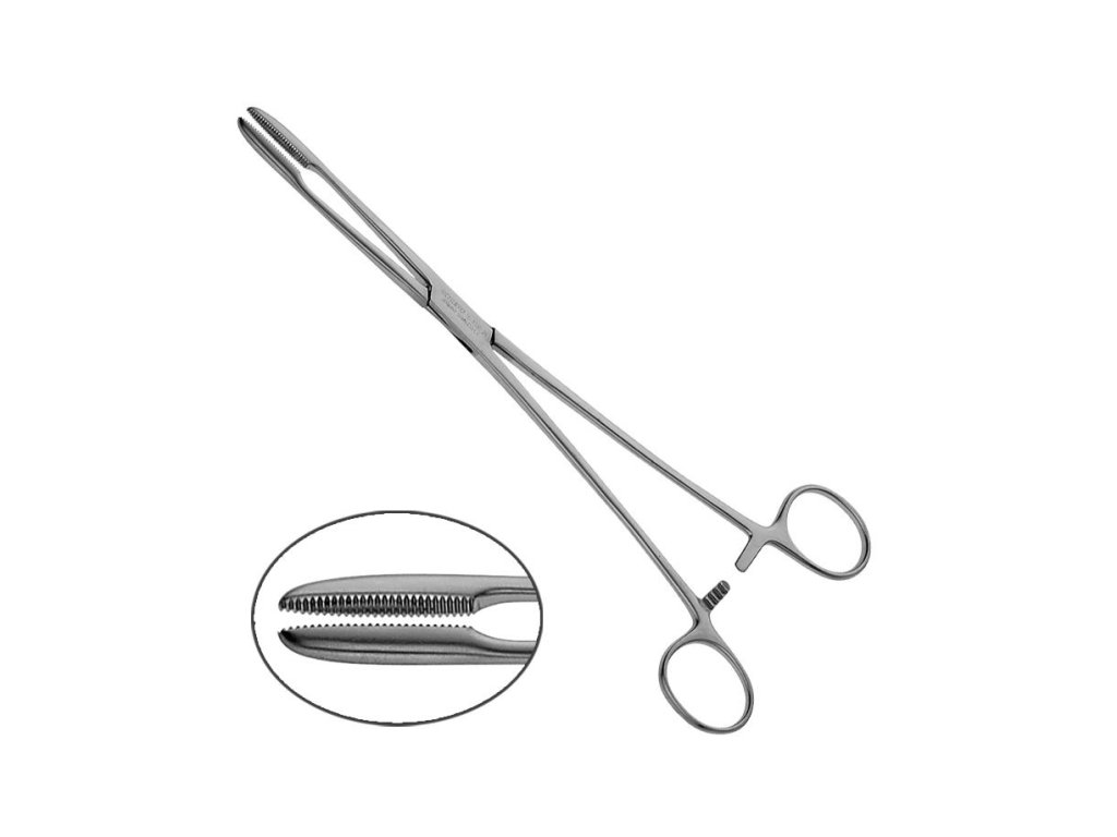Rebstock Maier forceps / pinzeta na dresing a drženie špongie, rovná, s aretáciou, 270mm je špecializovaný instrument určený pre presnú manipuláciu s obväzovým materiálom, špongiami či hubkami v operačnom poli. Vďaka rovnej konštrukcii a aretačnému mechanizmu (ratchet) umožňuje udržať materiál v požadovanej polohe bez potreby stáleho tlaku prstami. Klinec je citlivo vyhotovený tak, aby ste mohli pevne, ale šetrne držať krytie bez poškodenia tkaniva.