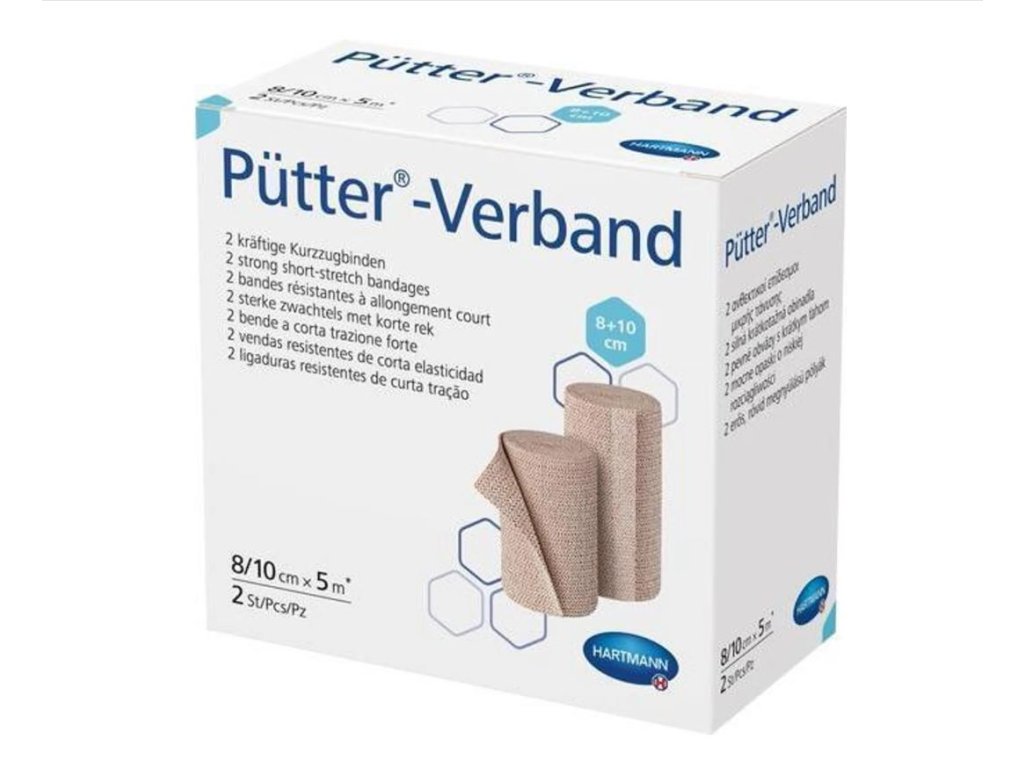 Pütter-Verband je elastické krátkoťažné ovínadlo od spoločnosti Hartmann určené na aplikáciu veľmi silnej kompresie pri ochoreniach žilového a lymfatického systému. Vďaka krátkej ťažnosti približne 85 – 90 % vytvára vysoký pracovný tlak pri pohybe a nízky pokojový tlak v pokoji, čím zabezpečuje účinnú a bezpečnú kompresívnu terapiu. Ovínadlo je vyrobené zo 100 % bavlny, čo zaručuje priedušnosť, mäkkosť a dobrú znášanlivosť pri dlhodobom nosení. Produkt je vhodný na opakované použitie, možno ho prať pri teplote do 95 °C a sterilizovať v autokláve pri 134 °C. Balenie obsahuje 2 kusy ovínadiel s rozmermi 10 cm × 5 m.