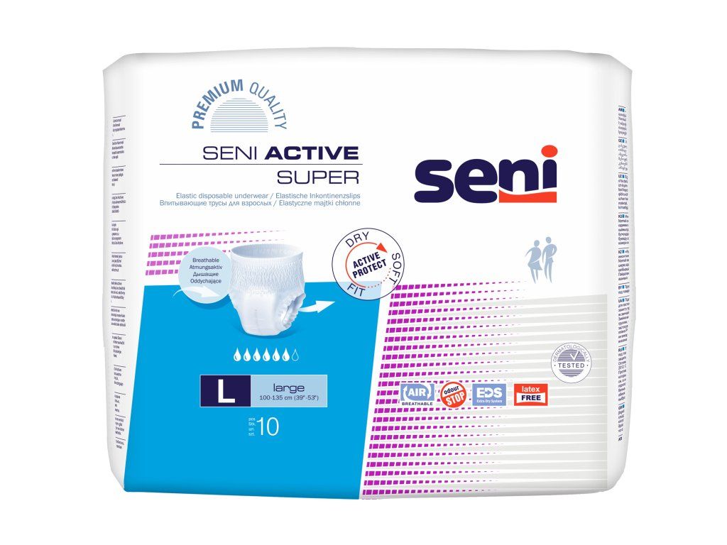 Seni Active Super veľkosť L 6 kvapkové nohavičky sú absorpčné zdravotnícke pomôcky určené pre osoby s inkontinenciou. Vysoko savé jadro pomáha rýchlo absorbovať tekutinu a udržiavať pokožku suchú. Anatomický tvar podporuje pohodlné nosenie a dobré prispôsobenie telu počas dňa aj noci.