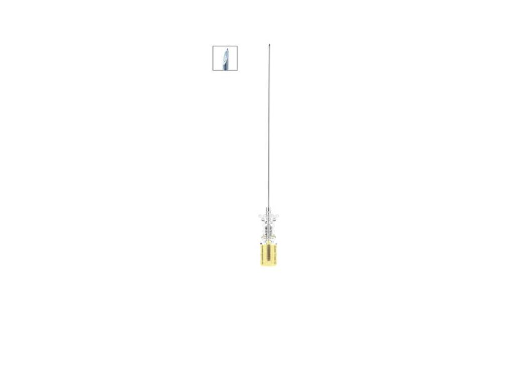 Spinocan 19G (1,10 × 88 mm) je spinálna ihla s hrotom typu Quincke určená na spinálnu anestéziu a diagnostickú lumbálnu punkciu. Quinckeov výbrus zabezpečuje nízku punkčnú silu a hmatateľné „kliknutie“ pri prepichnutí dura mater, čo umožňuje presné a kontrolované zavedenie. Ihla je vyrobená z nehrdzavejúcej ocele a vybavená priehľadným Luer-Lock úchopom, ktorý umožňuje okamžitú vizuálnu kontrolu spätného toku mozgovomiešneho moku. Farebné označenie v odtieni slonovej kosti (ivory) zodpovedá priemeru 19 G (1,10 mm). Produkt neobsahuje prírodný latex, čím sa znižuje riziko alergických reakcií.