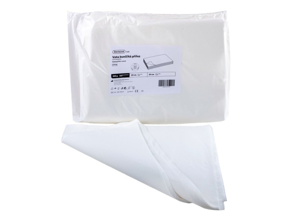 Steriwund vata buničitá v rezoch (20 × 30 cm, 500 g) predstavuje presne rezané prírezy z vysoko bielenej buničiny určené na jednorazové hygienické a medicínske použitie. Materiál je vyrobený zo 100 % buničiny s krepovanou štruktúrou, ktorá zvyšuje absorpčnú schopnosť a zabezpečuje spoľahlivé zachytenie tekutín. Vata má jemnú a rovnomernú textúru, je šetrná k pokožke a pri manipulácii sa nemrví ani neuvoľňuje vlákna. Presná rozmerová úprava 20 × 30 cm uľahčuje praktické použitie pri odborných úkonoch. Produkt je hygienicky balený vo fólii v balení po 500 g.