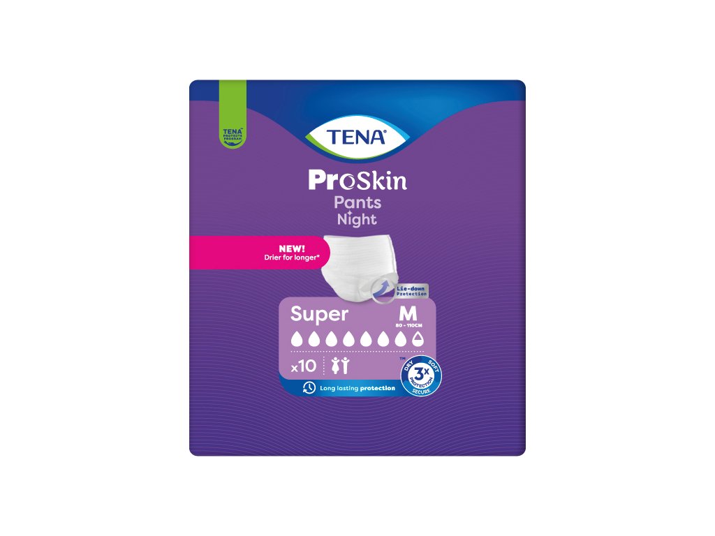 Naťahovacie absorpčné nohavičky TENA Pants Night sú praktickým riešením pre osoby s ťažkou inkontinenciou počas spánku. Sú vhodné pre mobilné a čiastočne mobilný osoby, pre mužov aj ženy. Vďaka absorpčnému jadru špeciálne prispôsobenému pre použitie vľahu poskytujú ochranu pri úniku moču či už spíte na chrbte alebo na boku.