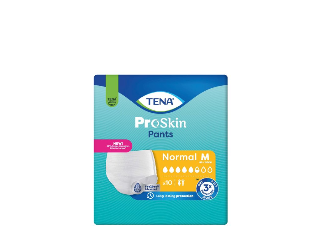 Naťahovacie absorpčné nohavičky TENA Pants Normal sú praktickým riešením pre mobilných a čiastočne mobilných pacientov so strednou až ťažkou inkontinenciou. Vhodné pre ženy aj mužov. Jednoducho sa obliekajú a vyzliekajú ako bežná spodná bielizeň. Okamžite absorbujú moč a uzamknú ho vo vnútri svojho savého jadra, čím podporujú zdravie pokožky.